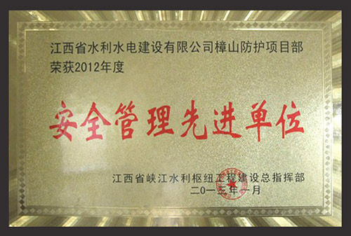 2013年2月,江西省峡江水利枢纽工程建设总指挥部授予我公司樟山防护工程项目部“2012年度安全管理先进单位”荣誉称号,项目管理人员彭红军、邓敏被评为峡江水利枢纽“安全生产先进个人”。